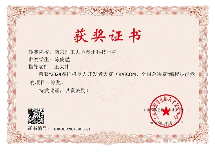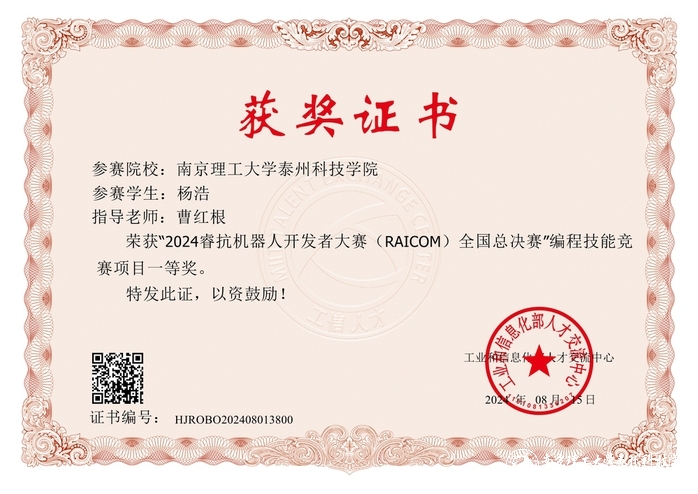 近日,2024年睿抗机器人开发者大赛(RAICOM)-编程设计CAIP赛道全国总决赛结果揭晓。我校计算机科学与工程学院姜枫、曹红根、高广银、王大伟四位教师组成的指导老师团队,指导学生在比赛中共获得江苏省一等奖2项、二等奖8项、三等奖10项。参加国赛的10位同学全部获奖,共获得全国一等奖3项、二等奖3项、三等奖4项。其中21计算机1班杨浩、陈俊燃、22软件(嵌)马宇乐三位同学获国家一等奖,实现我校在该赛事上的历史性突破。