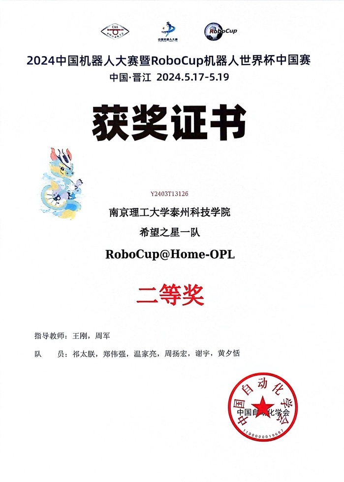 5月16至19日,2024 RoboCup机器人世界杯中国赛在福建晋江国际会展中心成功举办。在我校王刚、周军等老师悉心指导下,参赛师生奋力拼搏、克服重重困难,通过校赛选拔优秀队伍参加国赛,经过激烈角逐,我校学子首次参赛夺得RoboCup@Home-OPL赛项全国总决赛二等奖1项。