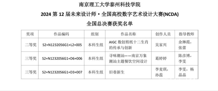 城市建设与设计学院环境设计专业和数字媒体艺术专业参赛团队,从整体设计构思到作品每个细节,指导老师和学生在讨论、沟通中,对参赛作品进行反复“打磨”,付出艰辛的努力,最终夺得包括3项国家级奖项和4项一等奖在内的16个省级奖项。其中我校杨晶晶老师作品《百姓日用即道解读 MG 动画》荣获省级三等奖。余琳霞、张蕾老师指导的作品《AIGC 数创剪纸十二生肖的传承与创新》作者(吴家兴),荣获省赛一等奖和国赛二等奖。陈彦博、李雯老师指导的作品《寻味潮汕——南京万象潮汕主题餐饮空间设计》作者(葛婷婷);李雯、杨晶晶老师指导的作品《旧巷新生》作者(李麦琪、孙蕊),荣获省赛一等奖和国赛三等奖。