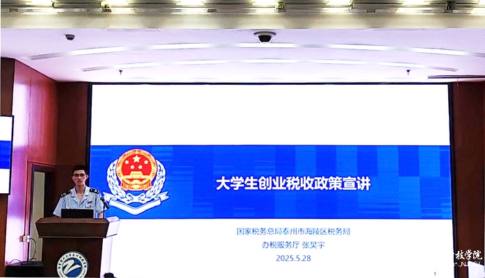 海陵区税务局办税服务厅负责人张昊宇向同学们介绍了适用于大学生创业的多项税收优惠政策,并结合实际案例鼓励创业学生合规纳税,稳步发展。