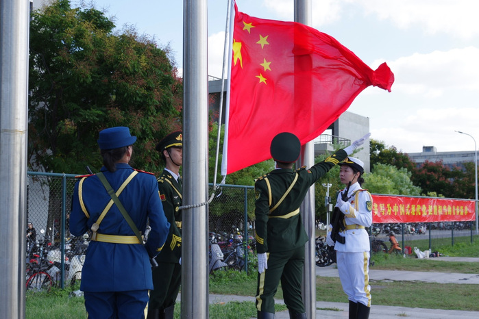 国旗护卫队迈着整齐划一、铿锵有力的步伐,护卫着国旗走向升旗台。伴随着雄壮的国歌声,鲜艳的五星红旗冉冉升起,全体人员肃立行注目礼,现场气氛庄重肃穆。