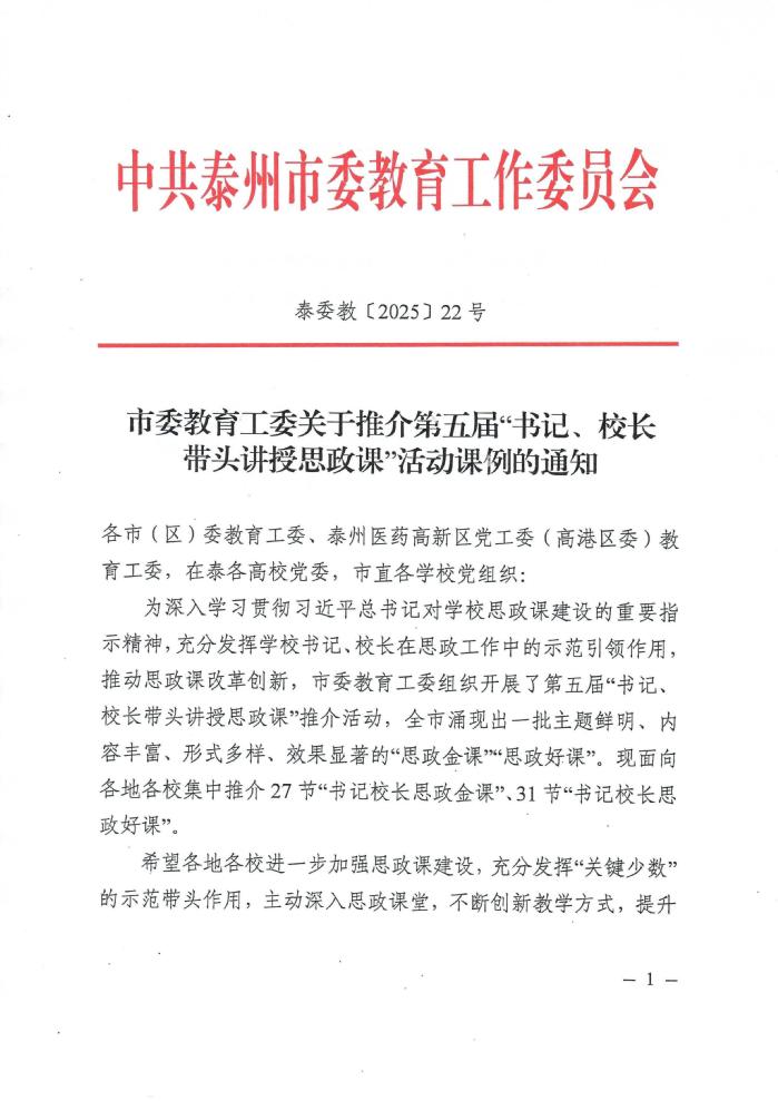 近日,中共泰州市委教育工作委员会公布泰州市第五届“书记、校长带头讲授思政课”活动课例评选结果,院长杨森、党委书记孙元鹏讲授的思政课获评泰州市“书记校长思政金课”。