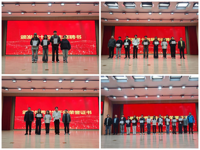 大会最后,后勤保卫处全体成员为上一届优秀干事、优秀学生干部颁发荣誉证书,并向第十四届校生管会部长团、主席团颁发聘书。