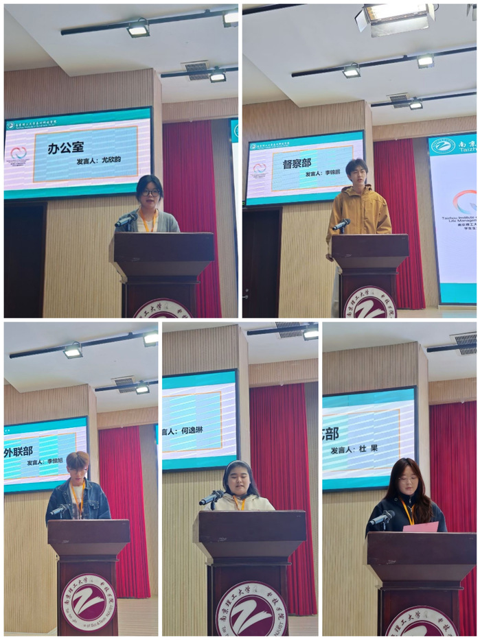 随后,校生管会办公室负责人尤欣韵、督察部负责人李锦鹏、外联部负责李恒旭、后勤部负责人何逸林、文艺部负责人杜果分别进行任职发言,就各部门的工作进行简要阐述,并对后续工作提出计划与展望。